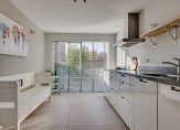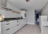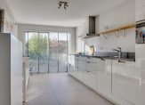 Aan voorzijde gesitueerde, rechte keukenopstelling met onder andere de volgende inbouwapparatuur: oven / magnetron (2023), koel- en vriescombinatie, vaatwasmachine van het merk Miele, inductiekookplaat, rvs- afzuigkap en veel kastruimte.
