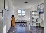 Mooie slaapkamer van 13 m2 met veel lichtinval door de grote raampartijen.