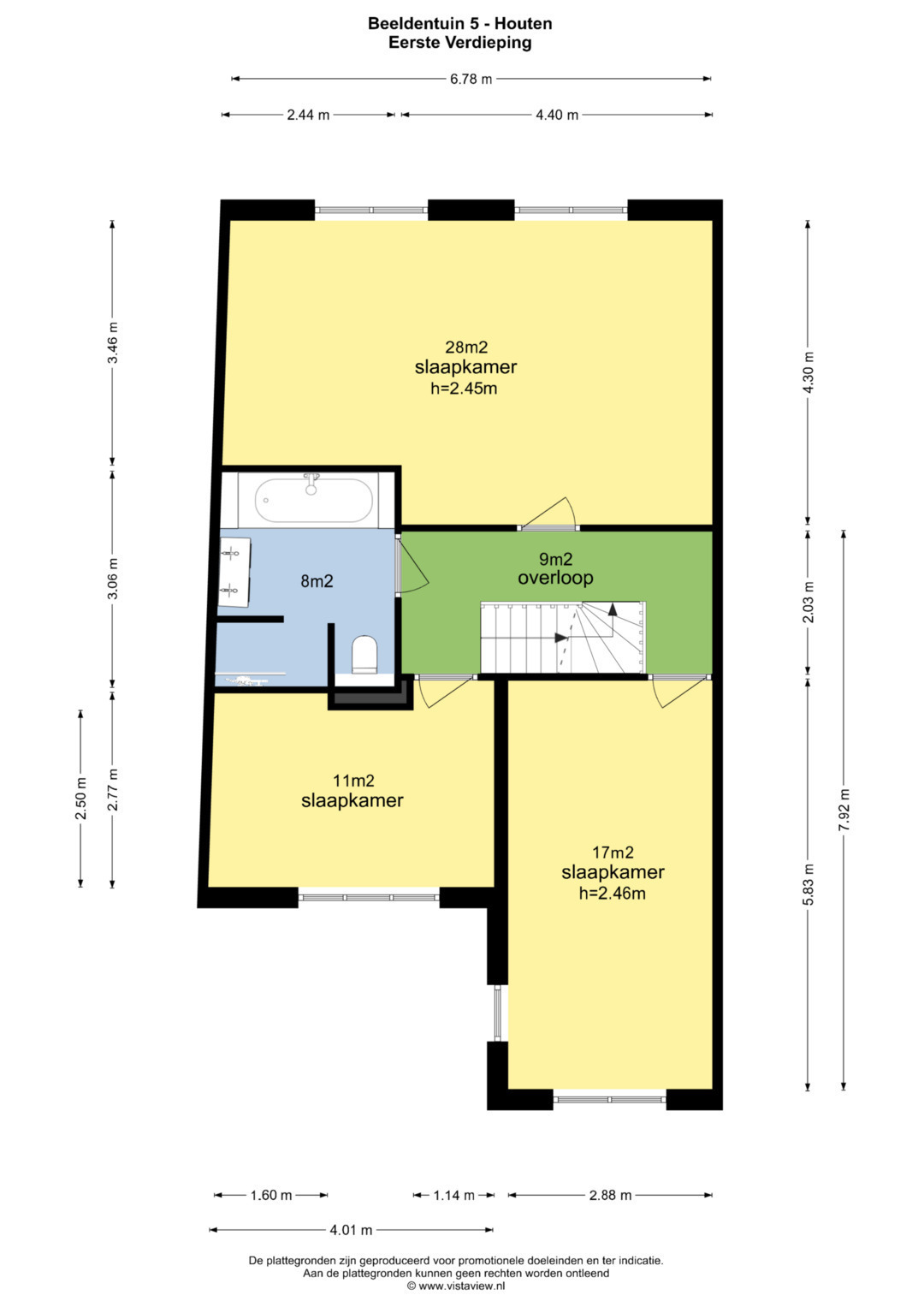 EERSTE VERDIEPING: overloop, drie slaapkamers van 11, 17 en 28 m2. Het is mogelijk om hier 4 slaapkamers te realiseren door de hoofdslaapkamer te splitsen zoals ook de oorspronkelijke indeling was.