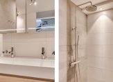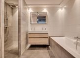 Luxe en in 2021 geheel vernieuwde badkamer met ligbad, inloopdouche met regendouche, wastafelmeubel, vloerverwarming en designradiator.