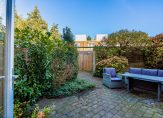 Tuingerichte woonkamer met trapkast en dubbele tuindeuren naar achtertuin met houten berging en een achterom.