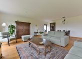 Toegang tot zeer royale living met grote raampartijen, zonweringen en woonkeuken.