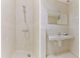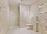 Ruime badkamer van 7 m2 met wastafel, wandcloset en inloopdouche.