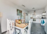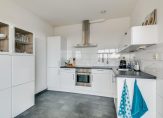 Lichte en ruime L- vormige woonkamer waar je ook de in hoekopgestelde keuken aantreft die is voorzien van de volgende inbouwapparatuur: koel- en vriescombinatie, elektrische kookplaat met daarboven een rvs-afzuigschouw, spoelbak, oven en een vaatwasmachine.