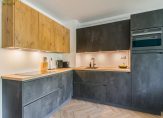 Royale woonkamer met een mooie breedte van 5.71 m met moderne keuken die is voorzien van een inductiekookplaat, vaatwasmachine, vriezer, koelkast en combi-oven.