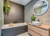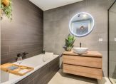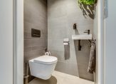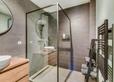 Entree/hal, luxe toiletruimte met wandcloset en fonteintje, meterkast met kabelaansluiting, badkamer met duo ligbad, elektrische radiator, wastafelmeubel met waskom, inloopdouche met ‘black steel’ look en scherm. De douche heeft een handdouche en een regendouche.