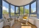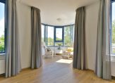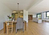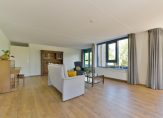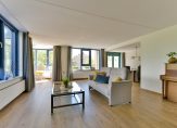 Prachtig ruime woonkamer met mooi uitzicht en sfeervolle erker van waaruit u mooi overzicht heeft op de buitenruimtes en het naastgelegen park en plas.