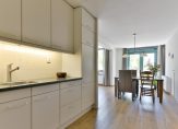 Naast de woonkamer de eethoek met dubbele tuindeuren en in L-vorm opgestelde keuken met de volgende inbouwapparatuur: oven met gaskookplaat en afzuigschouw, spoelbak, koelkast en veel kastruimte.