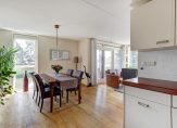 Zeer fraai gelegen woonkamer (ca. 34½ m²) met schuifpui naar het terras, deels overdekt door het balkon van de bovenburen en totaal 27 m². Via de eetkamer naar de complete keuken, deze is modern ingericht en v.v. inbouwapparatuur.