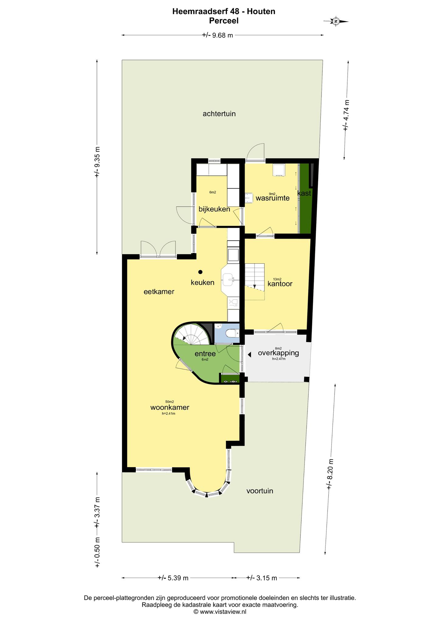 Entree, hal, toilet met fontein, meterkast, trap naar verdieping en toegang tot de woonkamer met erker en open keuken (circa 50 m2) met dubbele tuindeuren naar de achtertuin. Bijkeuken met keukenblok met granieten aanrechtblad en kastruimte. Inpandige berging (ca. 10 m2) met vaste schuifkastenwand, aansluiting voor wasmachine en droger, uitstortgootsteen, deur naar kantoorruimte en deur naar achtertuin.