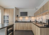 De woonkamer bevindt zich aan de voorzijde van de woning en heeft en mooie breedte van 5.70 meter. Brede doorgang naar de uitgebouwde woonkeuken met keukenopstelling die is voorzien van de volgende inbouwapparatuur: Miele wijnklimaatkast, Quooker, Liebherr koelkast, Miele combi-oven, Miele oven, Bora inductiekookplaat met geïntegreerd afzuigsysteem, Quooker, Miele vaatwasmachine, spoelbak en vaste kastruimte. Toegang tot achtertuin middels dubbele tuindeur vanuit de woonkeuken of de enkele deur vanuit de keuken. Deze deuren zijn voorzien van hor