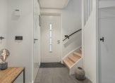 Entree/hal aan de zijkant van de woning, luxe toiletruimte met wandcloset en fontein, meterkast, garderobe met vaste kast, pomp vloerverwarming en trapopgang naar eerste verdieping.