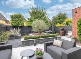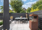 De achtertuin is strak betegeld in combinatie met grind en er is een nieuwe schutting geplaatst met spots als opbouwverlichting. Aan de achtergevel is elektrische zonwering aanwezig.