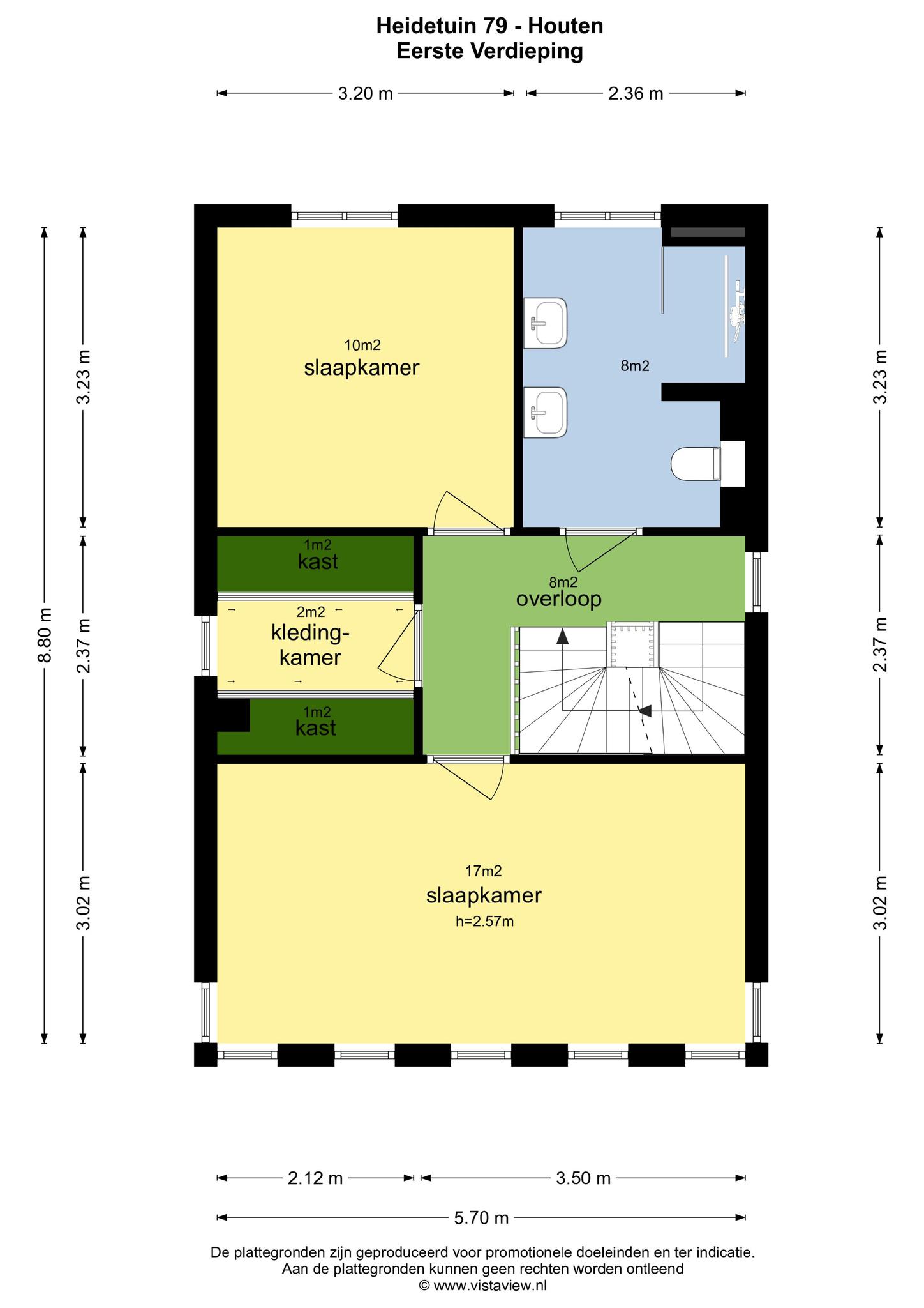 Slaakamer achterzijde van 10 m2, kledingkamer met twee vaste schuifkasten, slaapkamer voorzijde van de woning over de volledige breedte van het woonhuis van 17 m2.