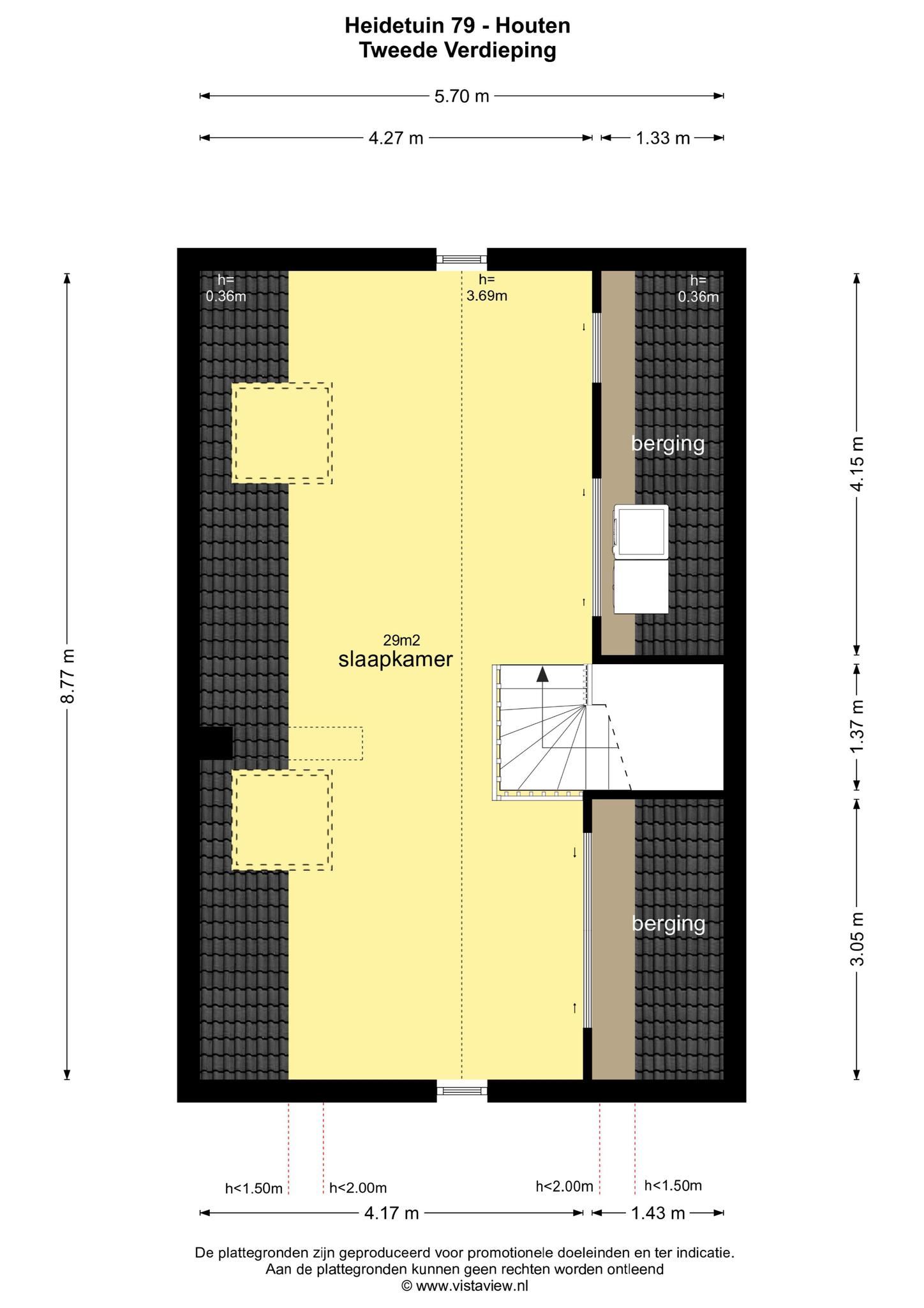 TWEEDE VERDIEPING: grote zolderverdieping van 29 m2 met mogelijkheid tot realiseren van twee slaapkamers. Deze verdieping beschikt over twee Velux dakvensters, airconditioning, vaste kastruimtes en plek voor de wasapparatuur. Door de vaste kasten staat de wasapparatuur uit het zicht. Deze verdieping is afgewerkt met een lichte laminaatvloer en licht schilderwerk.