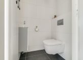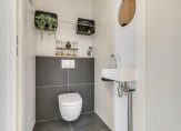 Entree/hal, meterkast, luxe toiletruimte met wandcloset en fontein, trapopgang naar eerste verdieping.