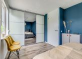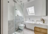 EERSTE VERDIEPING: overloop, twee slaapkamers waarbij de slaapkamer aan de voorzijde beschikt over een vaste kast en elektrische rolluiken. Badkamer met dakraam, ligbad, inloopdouche, wandcloset, wastafelmeubel met dubbele kraan en designradiator.