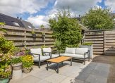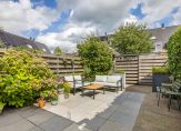 Uitgebouwde en tuingerichte woonkamer met trapkast met pomp vloerverwarming, mooie plek voor de eettafel bij de keuken, dubbele tuindeuren naar de achtertuin met houten berging en de achterom.
