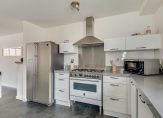 De ruime en lichte keuken bevindt zich aan de voorzijde en is voorzien van de volgende inbouwapparatuur: gascomfoor met oven en 6 pits gaskookplaat, rvs afzuigschouw, vaatwasmachine, close-in boiler, inbouwspots, veelk kastruimte en Amerikaanse koelkast.