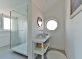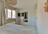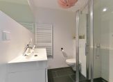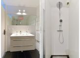 Op de eerste verdieping heeft deze woning drie slaapkamers en de badkamer. Deze badkamer beschikt over een wastafelmeubel met dubbele kranen, een inloopdouche met hand- en regendouche, wandcloset, designradiator en licht tegelwerk.
