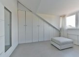 TWEEDE VERDIEPING: overloop, ruime slaapkamer met vaste kastenwand en bergruimte achter knieschotten. Vanaf overloop bereikbare badkamer met wastafelmeubel, opstelplaats wasapparatuur en een douchegelegenheid met regendouche en inbouwverlichting.