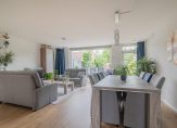 Tuingerichte woonkamer van 5.60m x 5.77m met schuifpui en tuindeur naar tuin op Zuidwesten met fraai straatwerk, gazon, borders, zonnescherm en een stenen berging met een achterom.