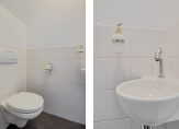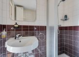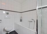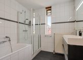 De badkamer is ruim en neutraal. Hier tref je een ligbad, douche, wastafelmeubel met dubbele kranen, een wandcloset en een radiator aan. Daglicht ontvang je hier via het vaste raamkozijn met te openen raampje.