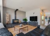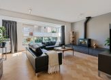 Als je ’s-avonds thuiskomt kun je parkeren op eigen terrein op de oprit. Beschik je over een elektrische auto dan laad je hier eenvoudig je auto op door gebruik te maken van de aanwezige laadpaal in combinatie met de 26 zonnepanelen. Bij binnenkomst word je meteen verrast door de prachtige visgraatvloer die de hal, woonkamer en keuken voorziet van een eigentijdse sfeer. De woonkamer bevindt zich aan de voorzijde van de woning en door de erkerpartij geniet je hier van leuk zicht op het veld met speeltoestellen. De houtkachel zorgt voor warmte en gezelligheid tijdens de wintermaanden.