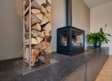 Toegang tot de woonkamer met aan de voorzijde de zitkamer met erkerpartij en mooie haard. De nieuwe haard is in 2023 geplaatst op een fraai hardstenen meubel.