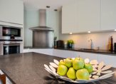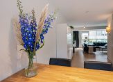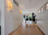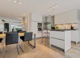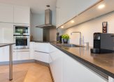 Brede doorgang naar de riante woon- c.q. leefkeuken aan de achterzijde van de woning met dubbele tuindeuren en zijlichten. Hier bevindt zich ook de fraaie, in hoek opgestelde keuken met inbouwapparatuur zoals: Quooker, oven, magnetron, inductiekookplaat, spoelbak, vaatwasmachine, koelkast en vriezer.