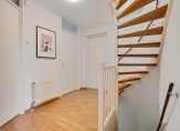 Entree/hal aan de zijkant van de woning met garderobe, in 2018 vernieuwde meterkast (vanwege plaatsing nieuwe keuken), trapopgang naar eerste verdieping en toiletruimte met wandcloset en fontein.
