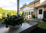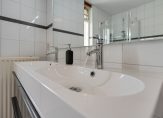 De badkamer is licht betegeld en compleet uitgerust met een ligbad, aparte douche, dubbele wastafel en zwevend toilet.
