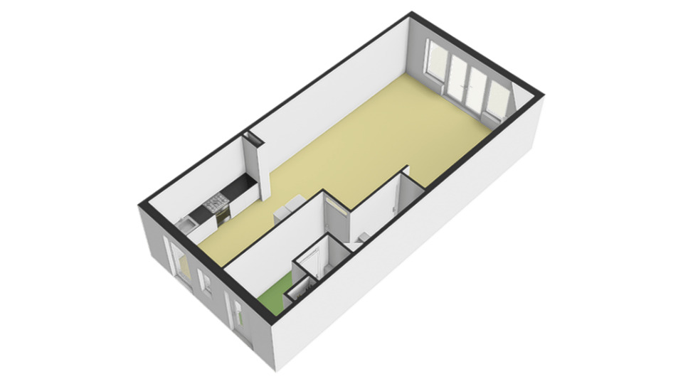 De keuken is aan de voorzijde van de woning geplaatst en is voorzien van diverse inbouwapparatuur. Ook hier zorgt de grote raampartij weer voor en mooie lichtinval en heb je direct zicht op de groenzone voor de woning.