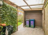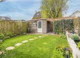 Ruime en brede achtertuin met overkapping aan de achtergevel. Deze overkapping is voorzien van doorzichtige platen waardoor het daglicht in de woonkamer goed blijft, er is hierboven een elektrische zonwering aanwezig, houten berging en een extra overkapping voor fietsen en/of motorfiets.