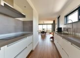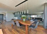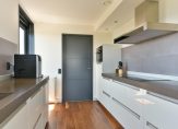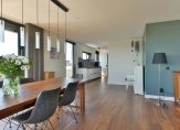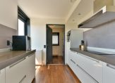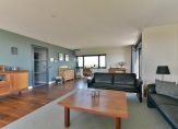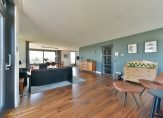 De living is heerlijk ruim en gesitueerd over de volledige breedte van het appartement; deze breedte bedraagt maar liefst 11 meter! Door deze grootte is het mogelijk om naast de living een extra werkkamer te realiseren. De living beschikt naast de ruime zithoek over een mooie plek voor een groot formaat eettafel en heeft u veel lichtinval door de grote raampartijen en schuifpui. Aan de buitenzijde zijn deze raampartijen voorzien van luxe en elektrisch bedienbare lamellen die zorgen voor een aangenaam comfort binnenshuis. Vanuit de woonkamer heeft u toegang tot de moderne keuken die is voorzien van een ceasar stone aanrechtblad en inbouwapparatuur met daarachter een mooie bijkeuken. Het riante dakterras bereikt u zowel vanuit de woonkamer als vanuit de keuken. Dit dakterras is een prachtige plek voor het plaatsen van uw lounge set en te genieten van zon en het prachtige weidse uitzicht. Het appartement is in de gang, keuken, bijkeuken en woonkamer voorzien van een fraaie Amerikaans noten vloer, deze draagt, in combinatie met de paneeldeuren, bij aan een warme sfeer binnenshuis.